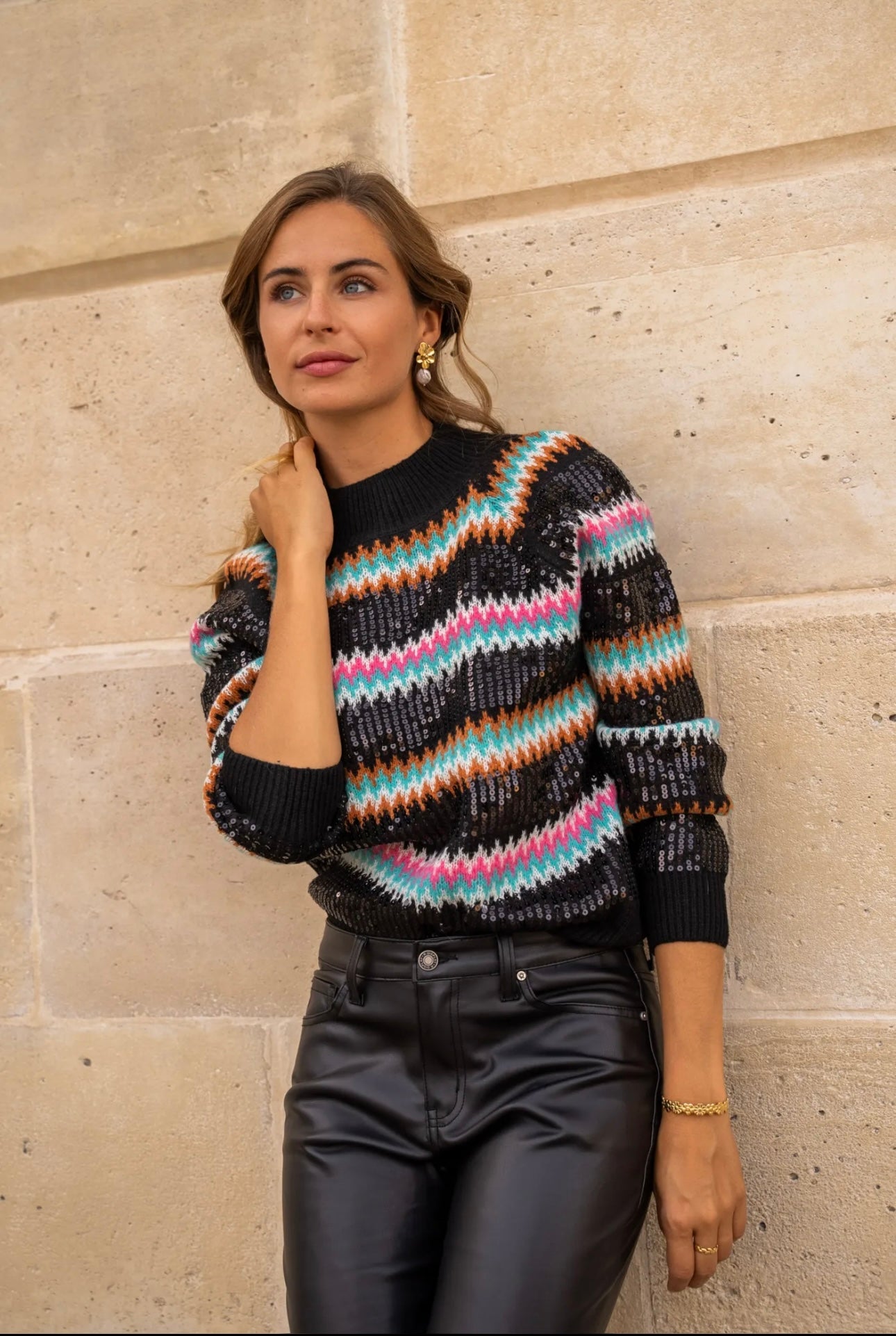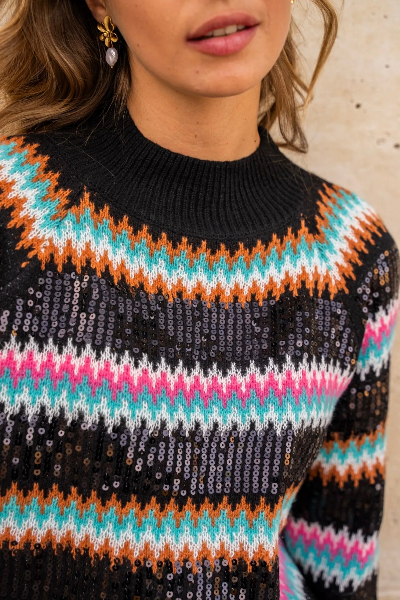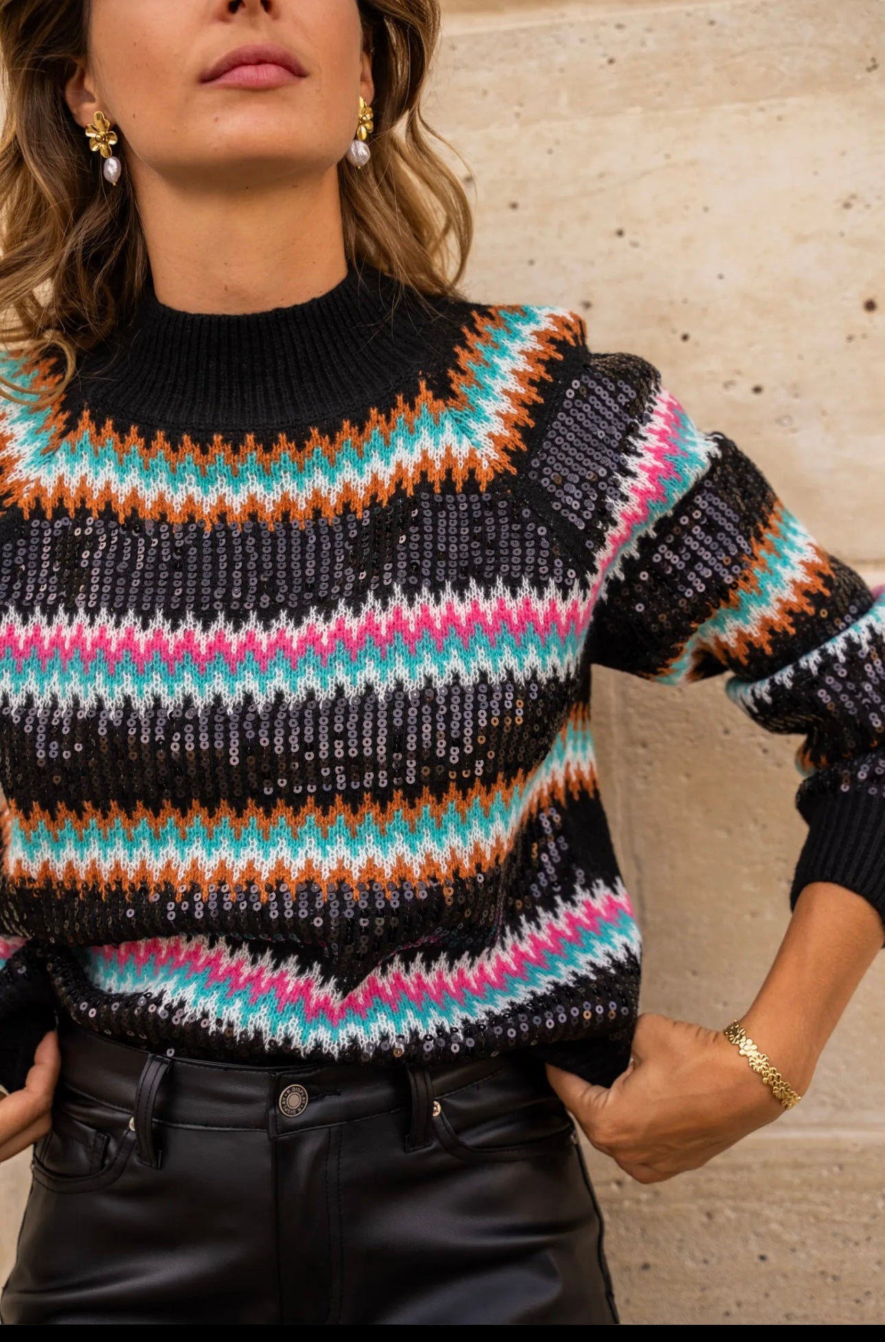 - schwarzer Pullover mit bunten Pailletten
