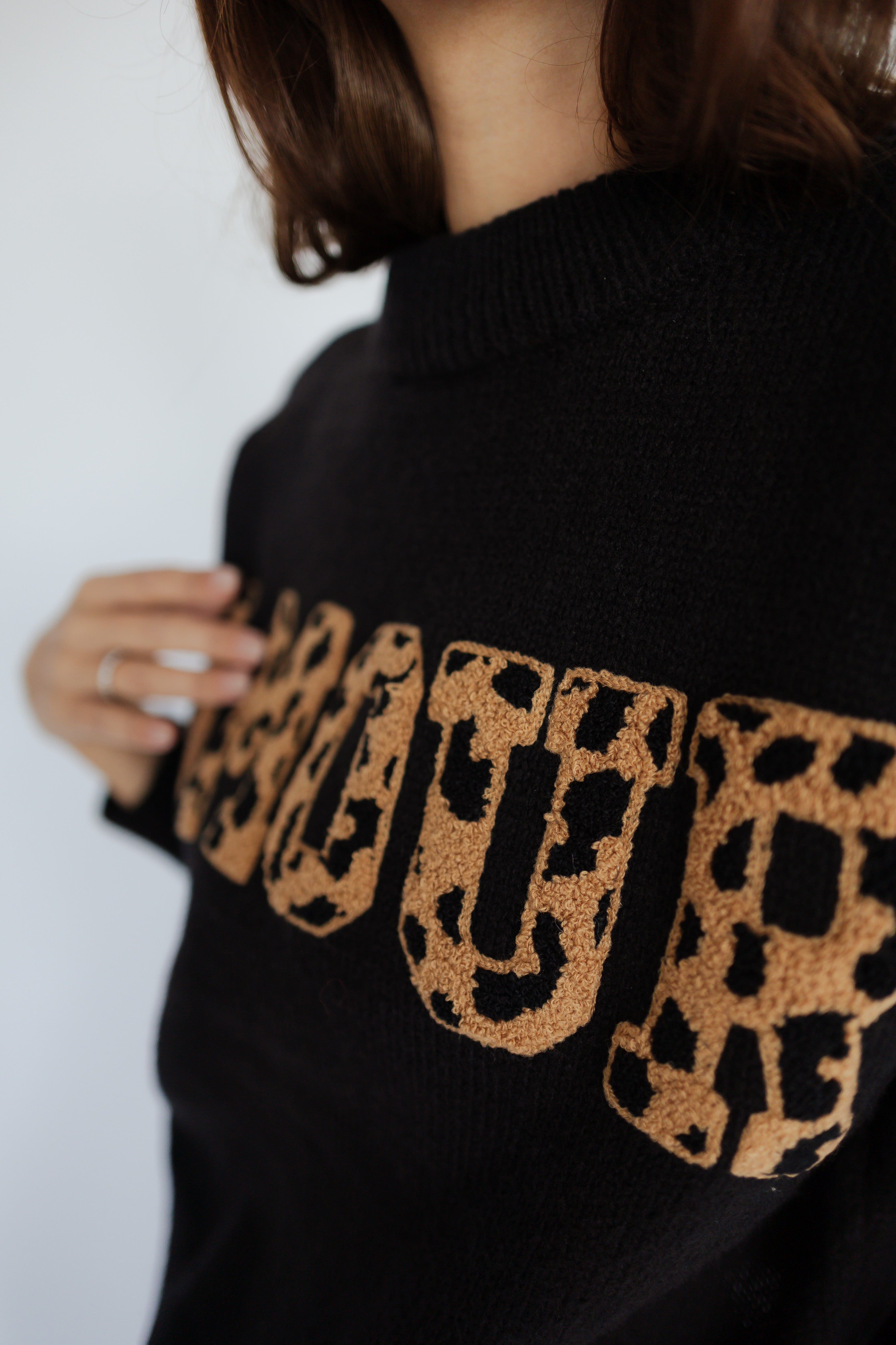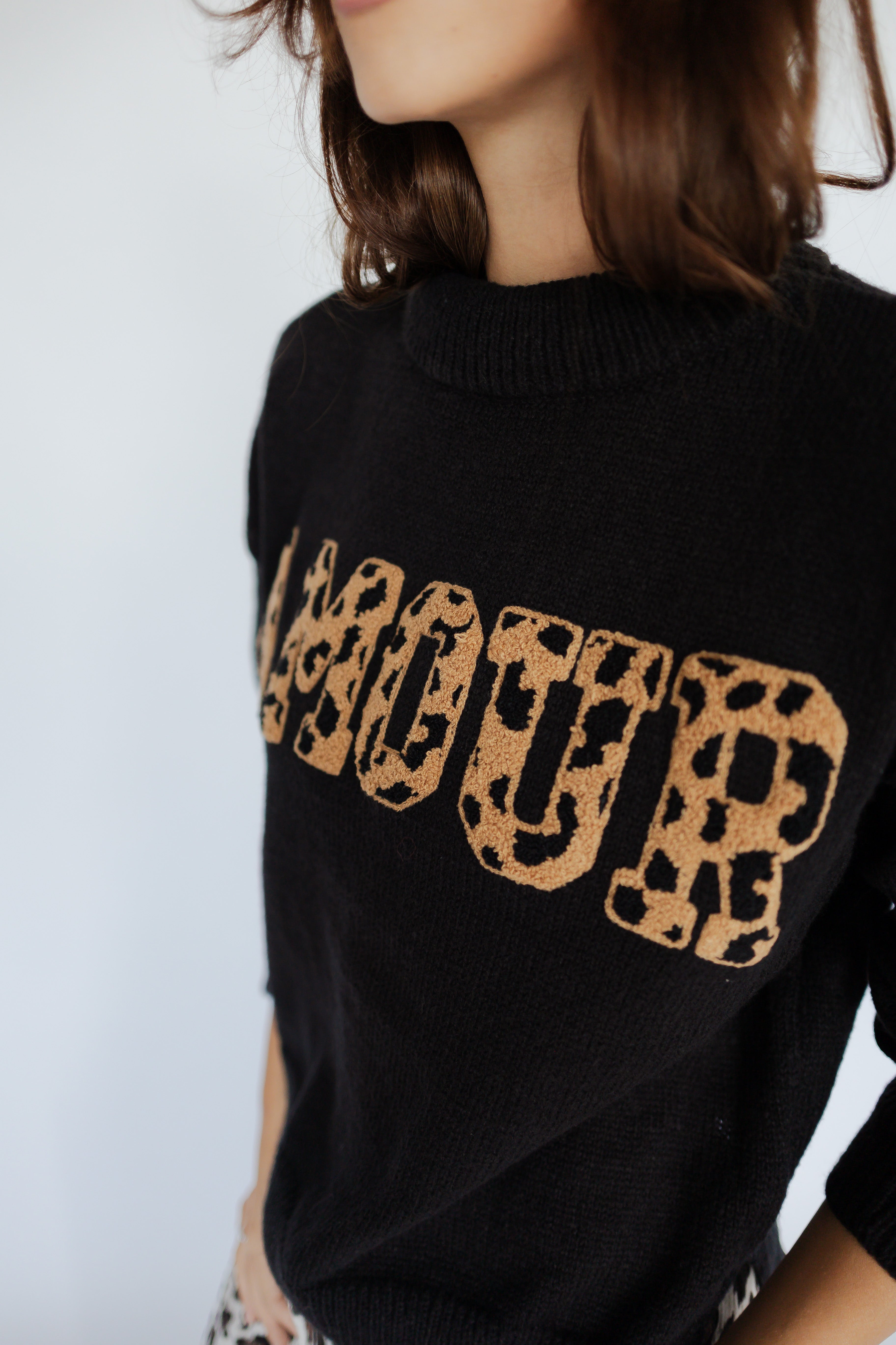 - schwarzer Pullover mit Aufschrift Amour in Leooptik