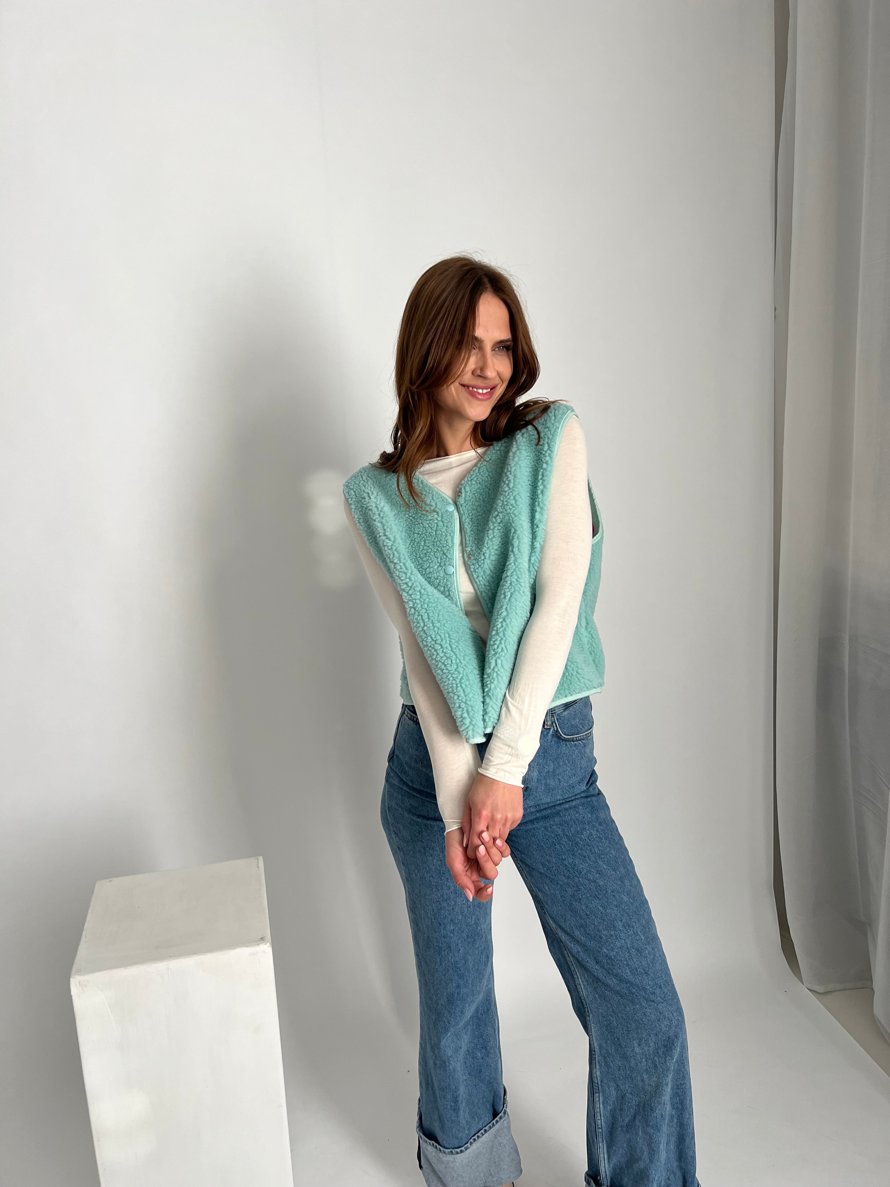 Diese trendige Teddy-Weste in zartem Aqua ist ein echtes Wohlfühl-Piece mit Style-Faktor. Das weiche, strukturierte Material sorgt für angenehme Wärme, während der lockere Schnitt vielseitig kombinierbar ist – perfekt über Longsleeves, Shirts oder feinen Basics.
